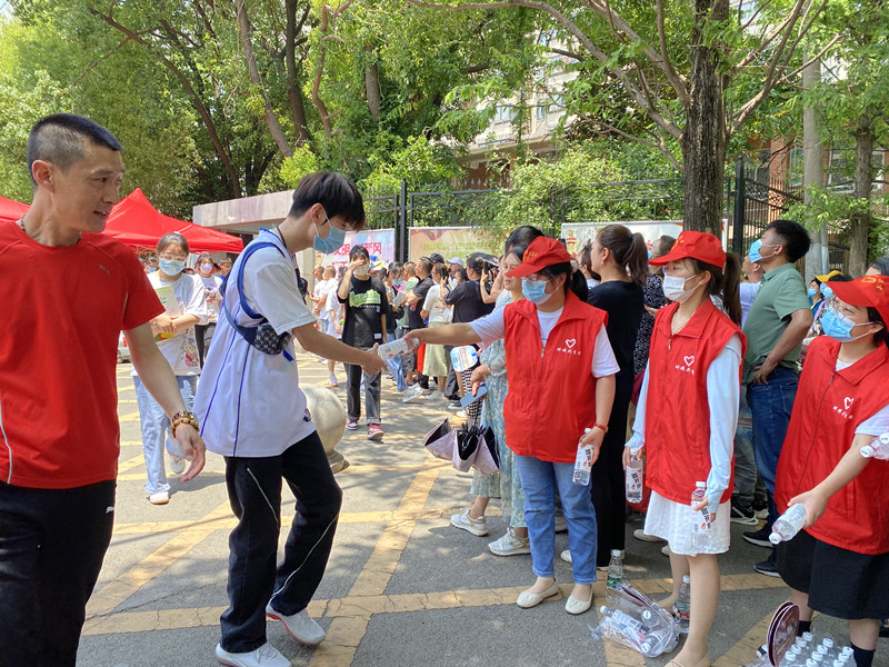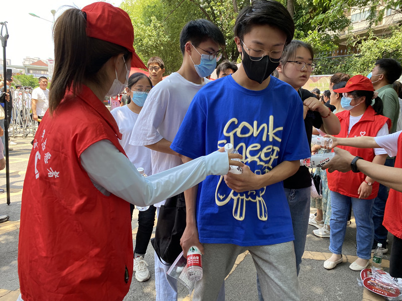 考场外,随着考试的结束,志愿者们为走出考场的考生们一一送上瓶装饮用水,希望这一份清凉让他们在紧张应考之后得到一份轻松,也能感受到全社会对他们的祝福与期待。