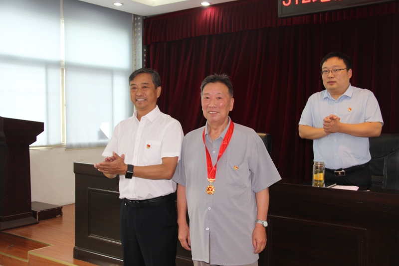 图为杜文斌为倪德准同志颁发“光荣在党50年”纪念章