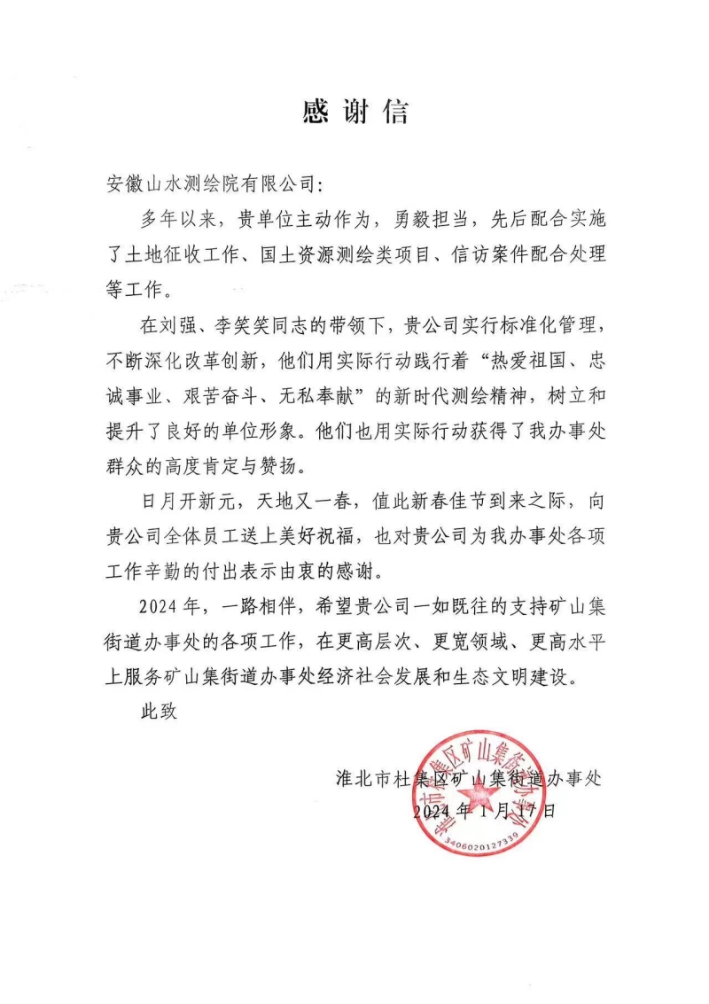近日,淮北市杜集区矿山集街道办事处向我队安徽山水测绘院有限公司发来感谢信,感谢公司多年来主动融入地方经济社会发展,积极提供技术支持与服务保障,助力办事处完成各项工作。