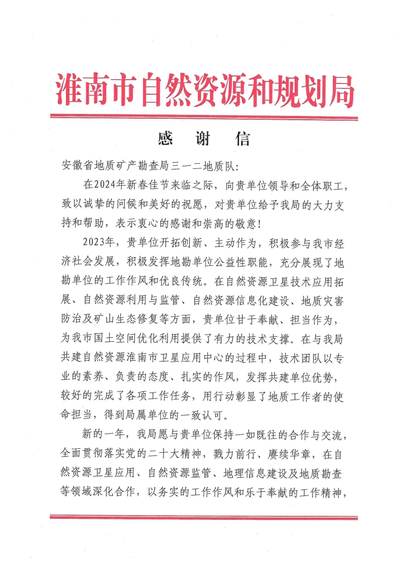 近日,我队收到来自淮南市自然资源和规划局的感谢信,信中对我队高分淮南中心一年以来的工作成果给予了肯定与感谢。