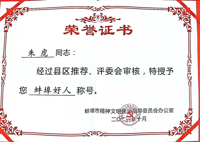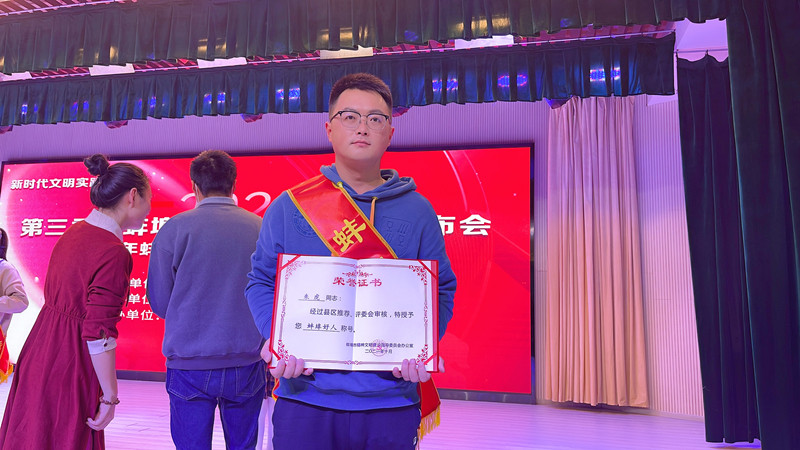 10月31日下午,第四季度“蚌埠好人”和第三季度市“新时代好少年”颁奖仪式在蚌埠六中汤河路学校报告厅举行。我队青年技术员朱虎荣获“蚌埠好人”荣誉称号。
