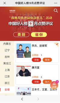 由中央文明办主办、中国文明网承办的“我推荐我评议身边好人”活动9月网络点赞评议正式开始。本月蚌山区有2名同志入围“中国好人榜”候选人:李兵、赵继军。现就做好本月网络点赞评议工作的有关事宜通知如下: