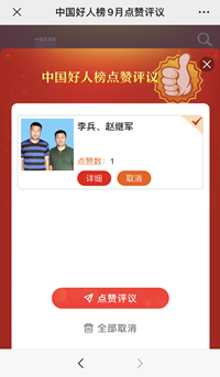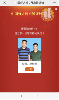 手机微信关注“中国文明网公众号”,点击“专栏”,点击“点赞好人”,选择省份安徽,选择李兵、赵继军点赞,确认完成。